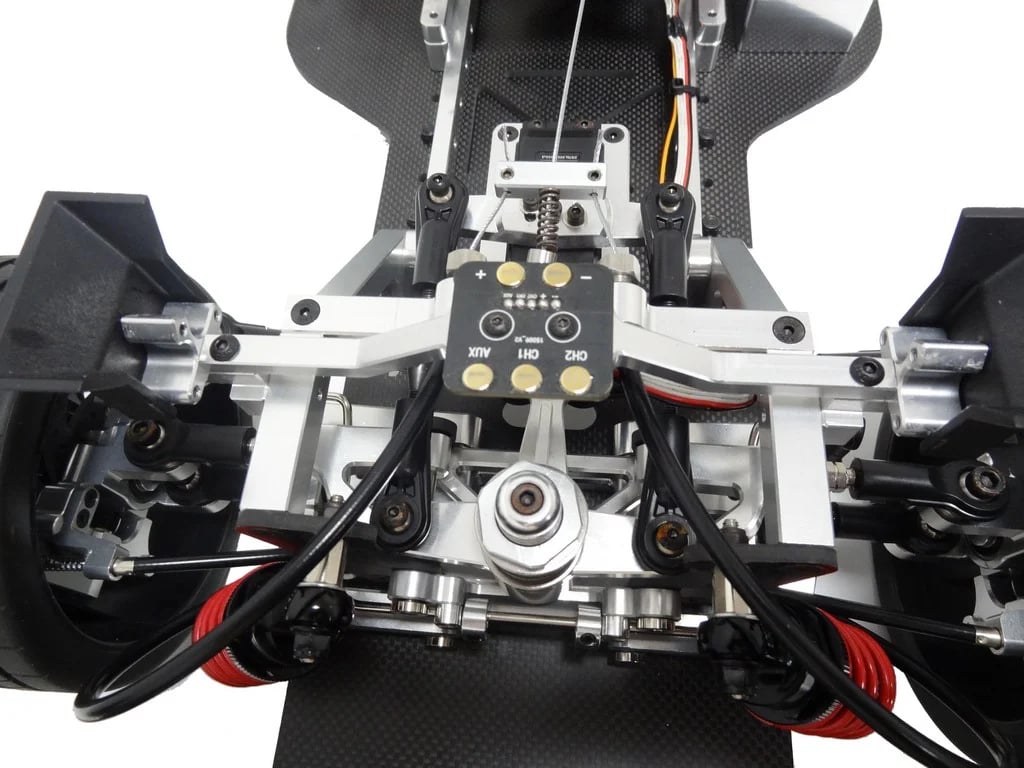 •Rear-Wheel Drive Layout: Complete with an aluminum-cased differential and upgraded oversized out-drives, 10mm thick rear axles, and adjustable aluminum steering servo saver for tight turns.
