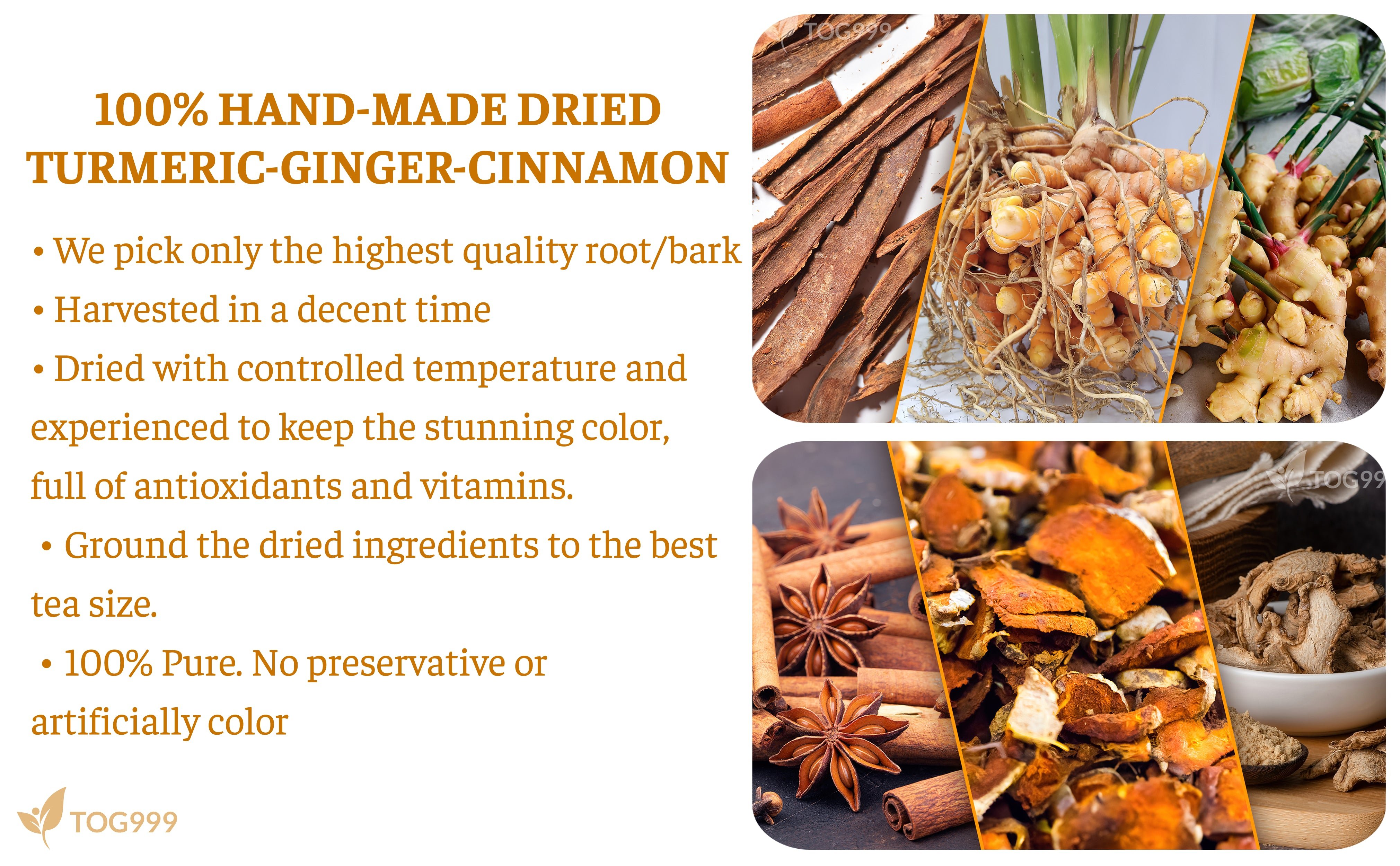 β FROM FRESHLY PICKED, NATURALLY DRIED TURMERIC, GINGER & CINNAMON: The best Turmeric, Ginger and Cinnamon are picked at a decent time, washed with fresh water, dried in the sun, ground with years of experience to the best tea size, and carefully packed to preserve the flavor and distinct aromatic effect.