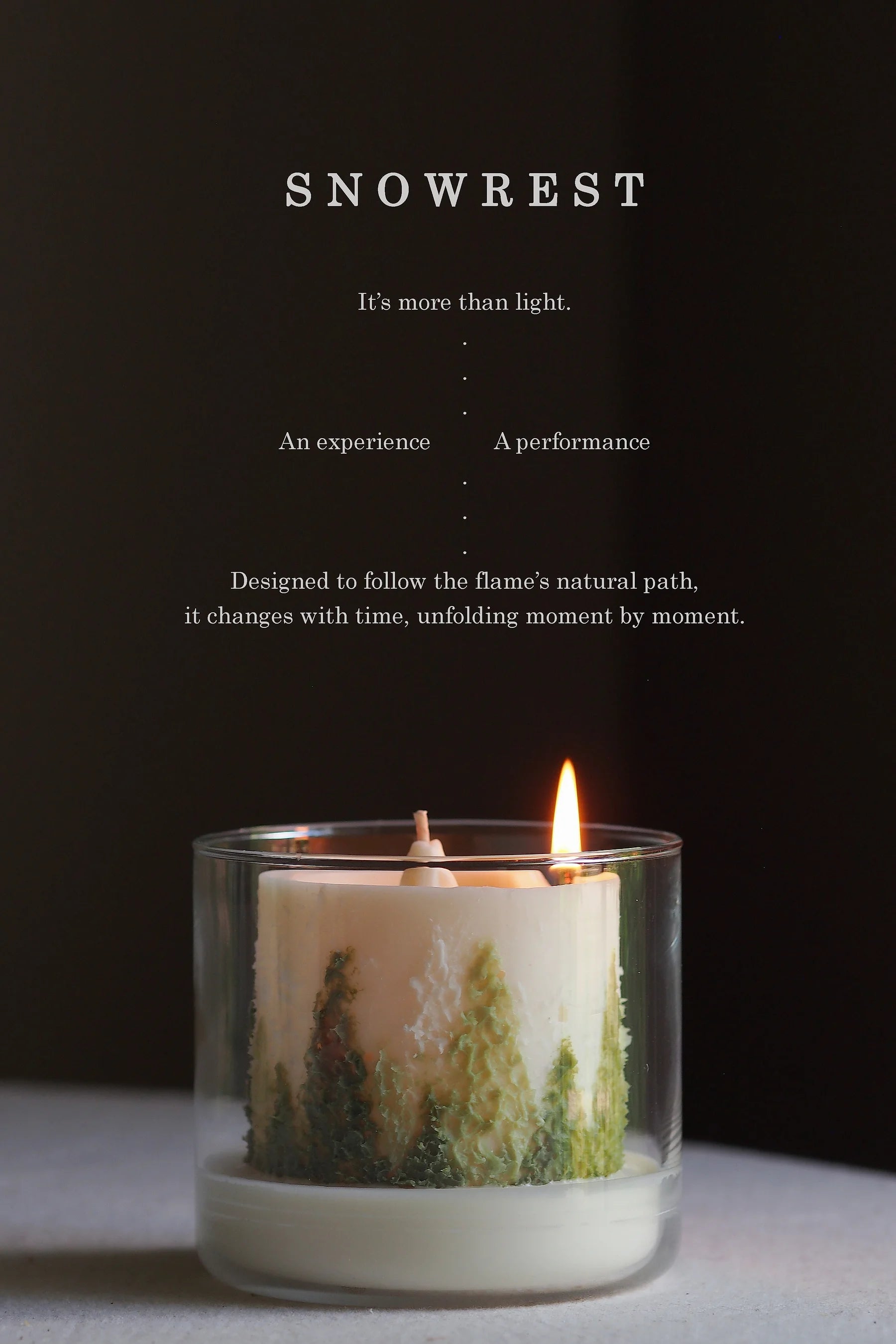 The spiral flame slowly melts the outer wax, revealing a snow-covered pine within. Minute by minute, the scene transforms — drifting snow, a glimpse of green, wax gathering at the tree’s feet. Each stage brings a new view, like a walk through a winter forest.